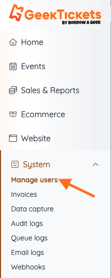 - Each user that will be using the scanning app to scan tickets will need to have an account on the GeekTickets platform. To create additional accounts for your organisation, click on the System Menu and choose Manage Users