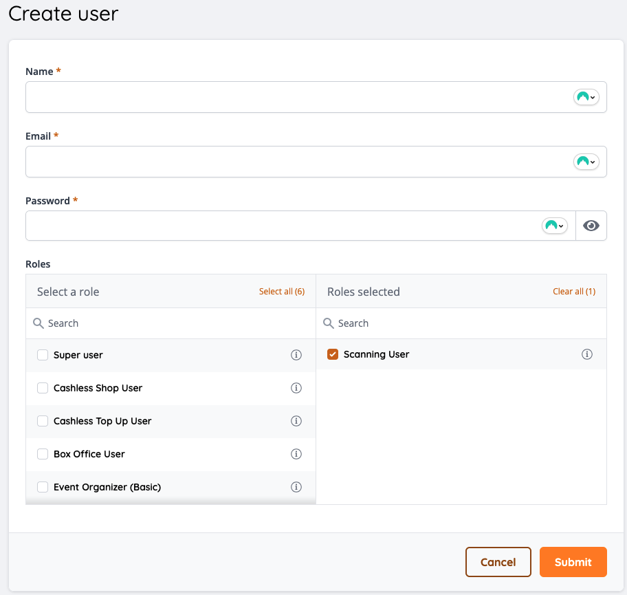The Name, Email, and Password fields are required. You should choose Scanning User as the role for this user and then click on Submit.
